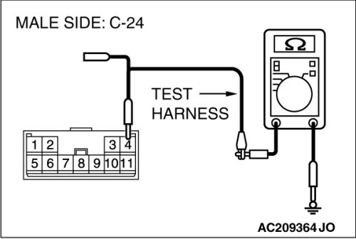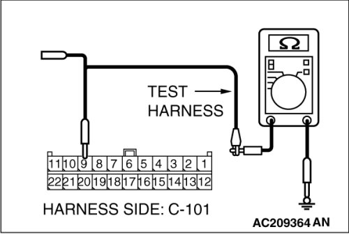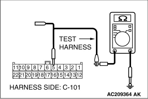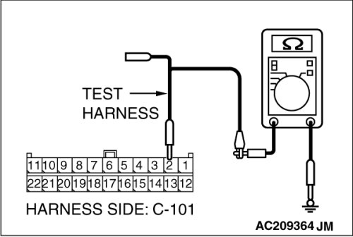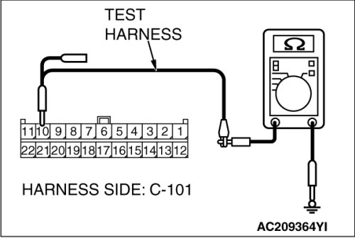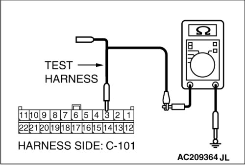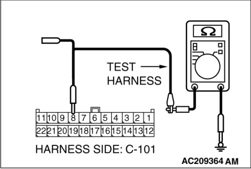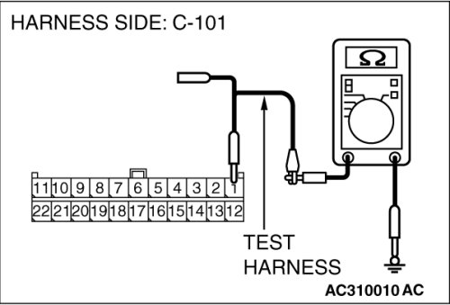 (middle-grade type)] or C-128 [multi-center display unit (Mitsubishi Multi Communication System)], and measure the resistance at the wiring harness side of joint connector (4) C-101.