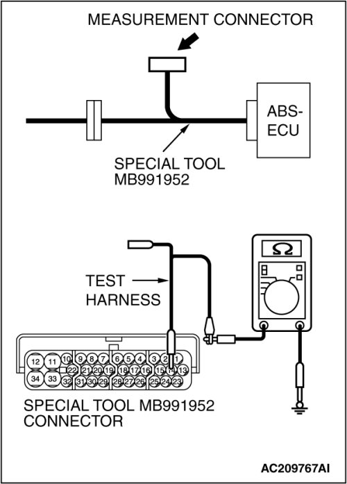 (2)Connect special tool MB991952 (ABS check harness) to the TCL/ASC-ECU and the wiring harness, and measure the resistance at special tool MB991952 (ABS check harness).
