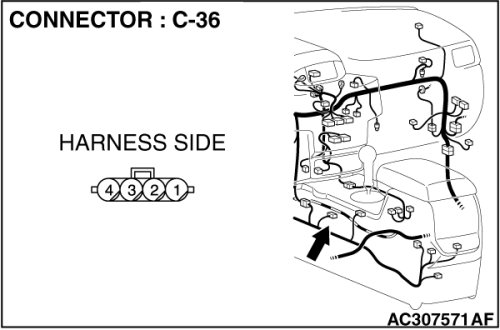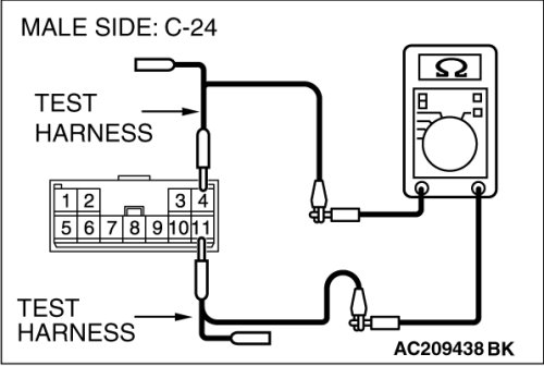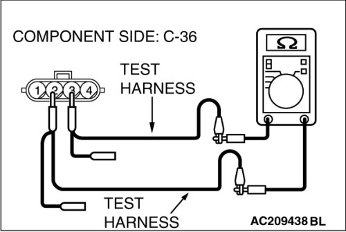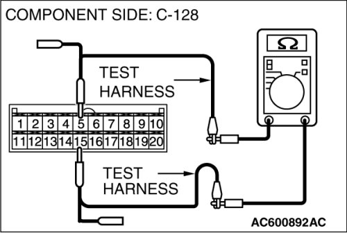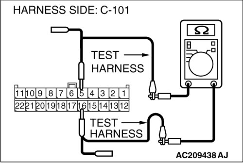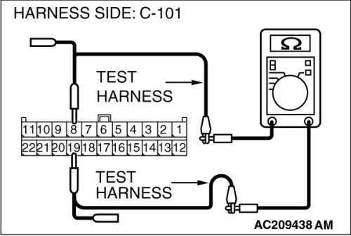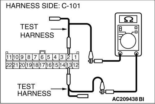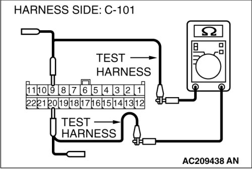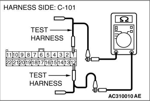 (middle-grade type)] or C-128 [multi-center display unit (Mitsubishi Multi Communication System)], and measure the resistance at the wiring harness side of joint connector (4) C-101.