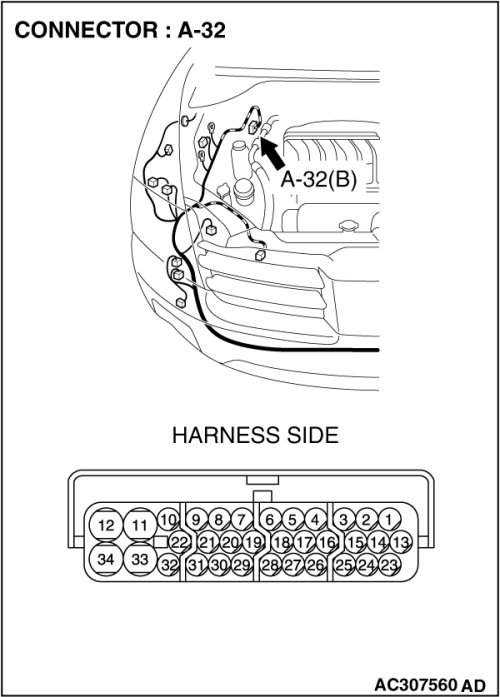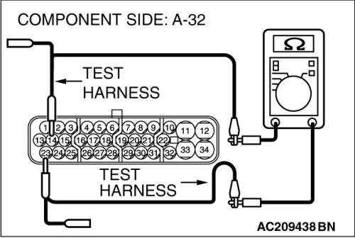 (1)Disconnect TCL/ASC-ECU connector A-32, and measure the resistance at the equipment side of TCL/ASC-ECU connector A-32.