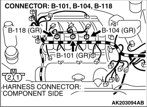 STEP 10. Check harness connector B-101, B-104, B-118 at right bank injector for damage.