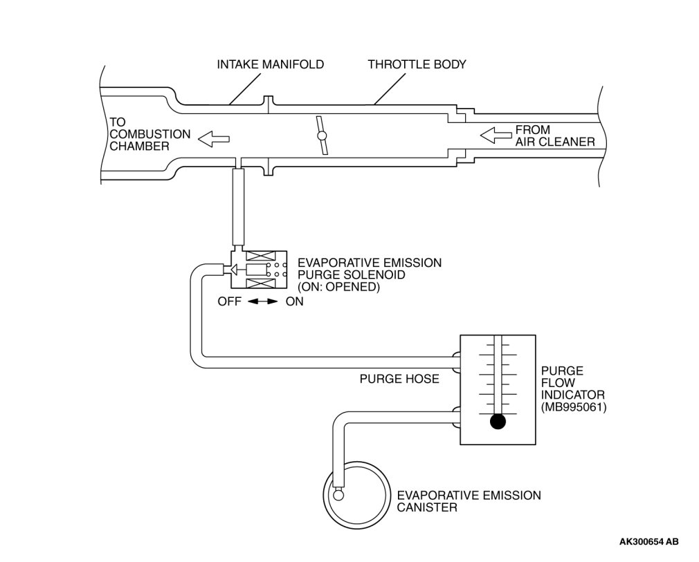 1. Disconnect the purge hose from the evaporative emission (EVAP) purge solenoid, and connect special tool MB995061 between the EVAP purge solenoid and the purge hose.