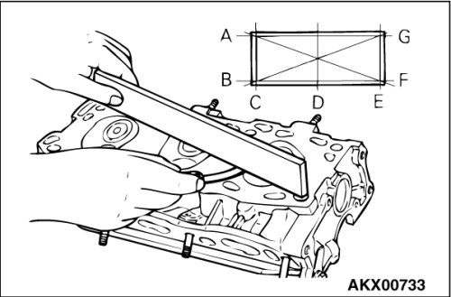 Check the cylinder head gasket surface for flatness by using a straightedge in the directions of A through G shown in the illustration.