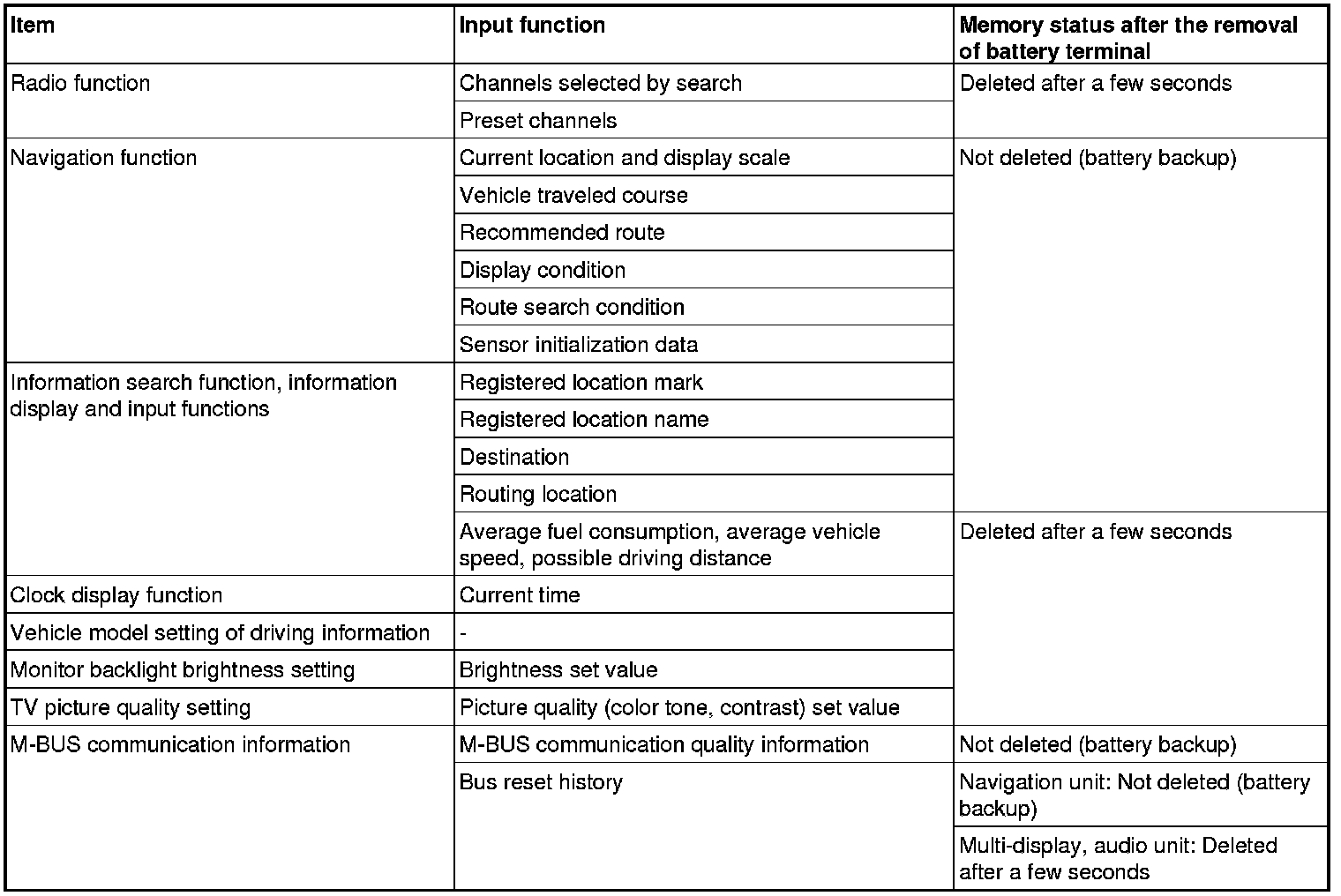 MMCS stores a large volume of information which is input at the discretion of customers. The memory of each information becomes as follows when the battery terminal is removed. Therefore, before removing the battery, the recording of preset channels is necessary. Depending on the time period of battery removal, the current location, destination, and others of the navigation function must be recorded.