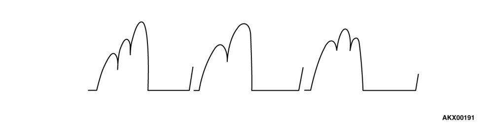 Identification of abnormal waveforms is easier when there is a large output current (regulator is not operating). (Waveforms can be observed when the headlights are illuminated.)