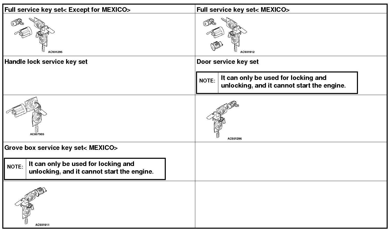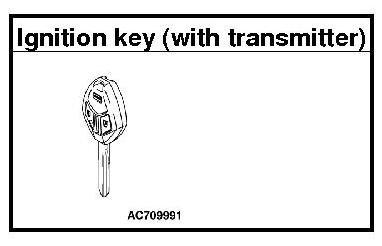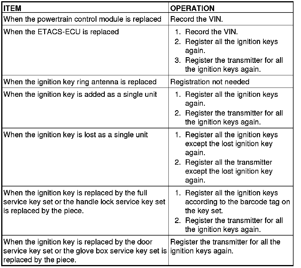 The ignition key contains a transponder (small transmitter), which retains an unique encrypted code. When replacing the parts of the immobilizer system, always register the encrypted code or VIN, or both of them according to the list below. The ETACS-ECU can retain a maximum of eight different encrypted codes. This means that a maximum of eight ignition keys can be registered.