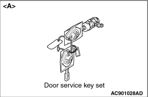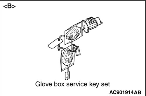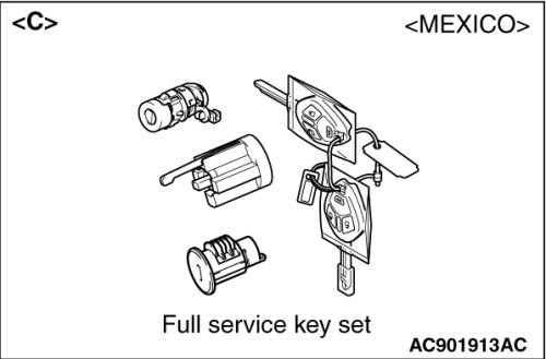 - Do not register the ignition keys other than the ignition key that starts the engine. (When replacing by the door service key set of illustration[ A] or the glove box service key set of illustration[ B], the engine cannot start if the encrypted code is registered with the barcode on the ignition key supplied simultaneously. If the ignition key using for each lock cylinder and starting engine is used as a common ignition key, replace by the full service key set of illustration[ C].)