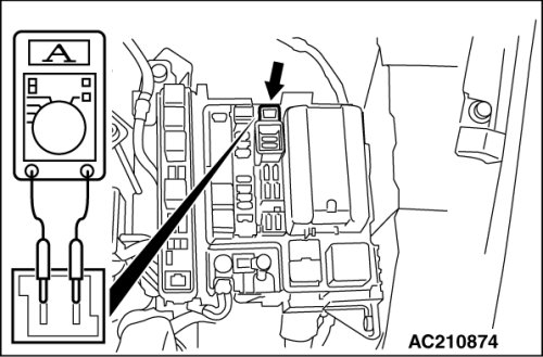 1. Remove the power window fuse and connect an ammeter as shown in the illustration.