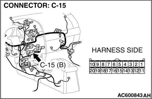 STEP 11. Check A/C-ECU connector C-15 for loose, corroded or damaged terminals, or terminals pushed back in the connector.