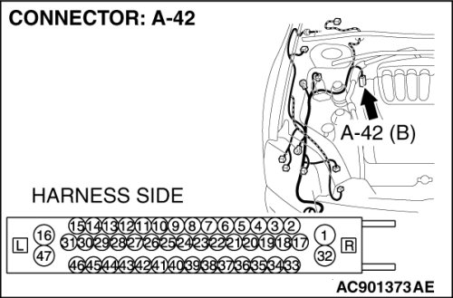 STEP 29. Check TCL/ASC-ECU connector A-42 for loose, corroded or damaged terminals, or terminals pushed back in the connector.
