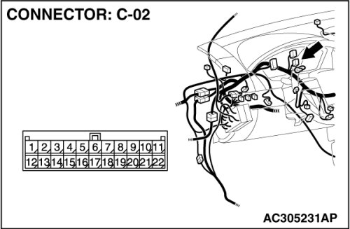 (1)Disconnect joint connector (3) C-02 and multi-center display unit connector C-31 [Mitsubishi Multi Communication System], and measure the voltage at the wiring harness side of joint connector (3) C-02.