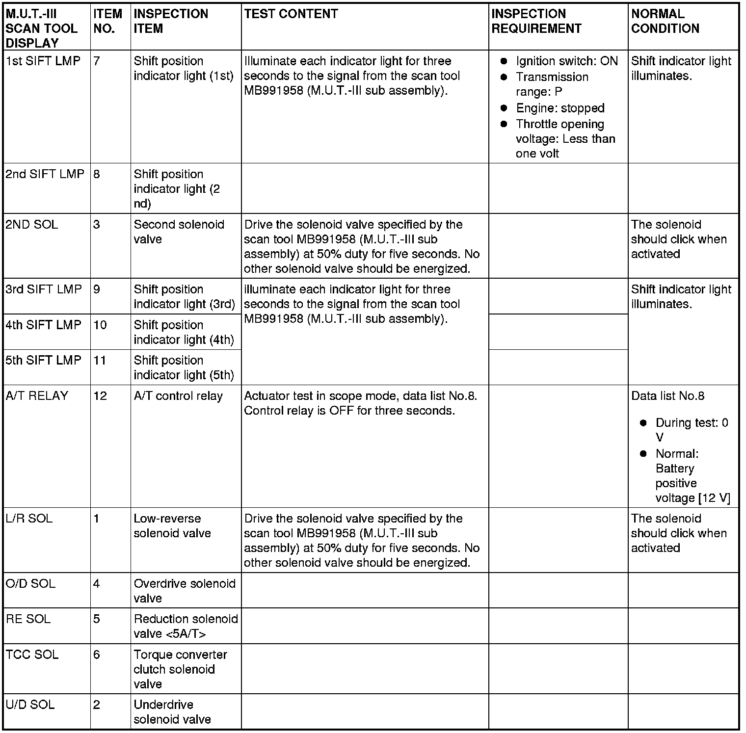 ACTUATOR TEST REFERENCE TABLE