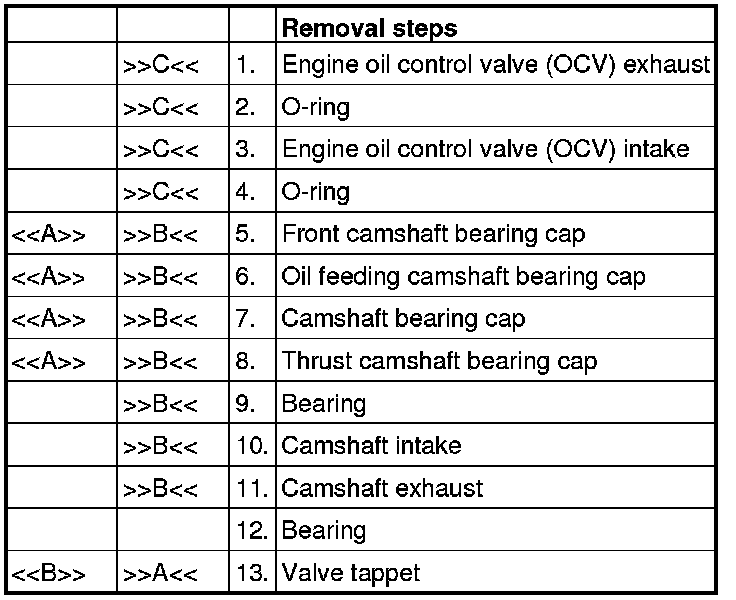 First remove a mounting bolt of the front camshaft bearing cap and then a mounting bolt of each camshaft bearing cap in the order shown in the illustration.