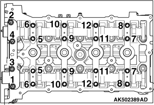 Loosing the camshaft bearing cap installation bolts in four to five steps. Do not loosen bolts in one step as this causes the valve spring force to push on the bolts and make them jump out causing damage to the threads.