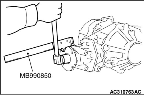 Use special tool MB990850 to hold the companion flange, and then remove the companion flange self-locking nut.
