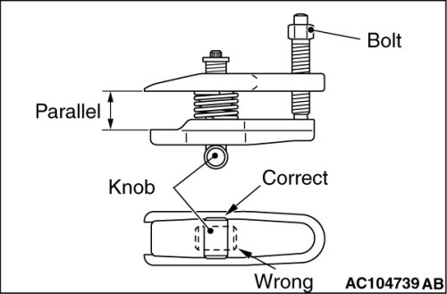 To adjust the special tool jaws to be parallel, set the knob as shown in the figure so that it functions as a fulcrum of the jaws.