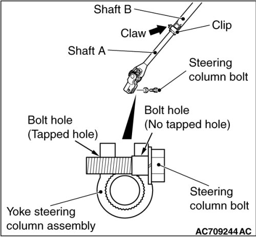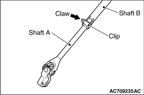 1. Pinch the claw of the clip shown in the figure. While sliding shaft A from shaft B, connect the steering column shaft assembly with the steering gear and linkage assembly.