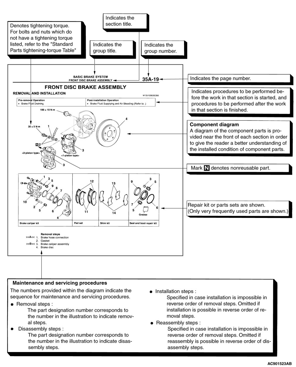 The service steps are arranged in numerical order. Attention to be paid in performing vehicle service are described in detail in SERVICE POINTS.