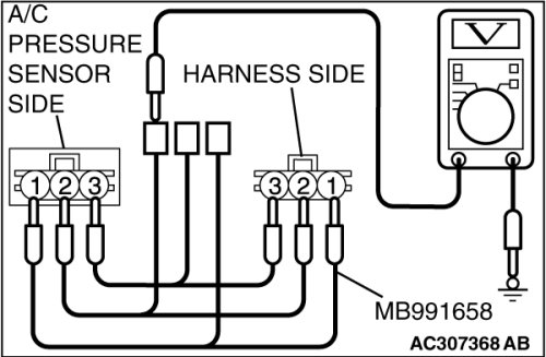 2. Disconnect the A/C pressure sensor connector and connect special tool test harness MB991658 as shown in the illustration.