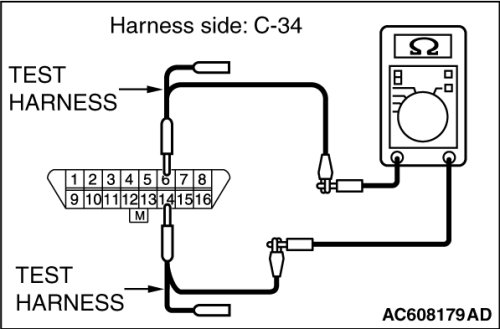 STEP 5. Check the wiring harness between data link connector C-34 and ETACS-ECU connector C-301 for line-to-line short. Measure the resistance at data link connector C-34.