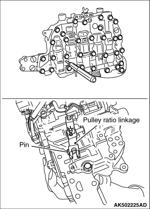 (1) Insert pins etc. (dia.3 mm (0.12 in)) into linkage stopper holes of the control valve assembly to fix the pulley ratio linkage.