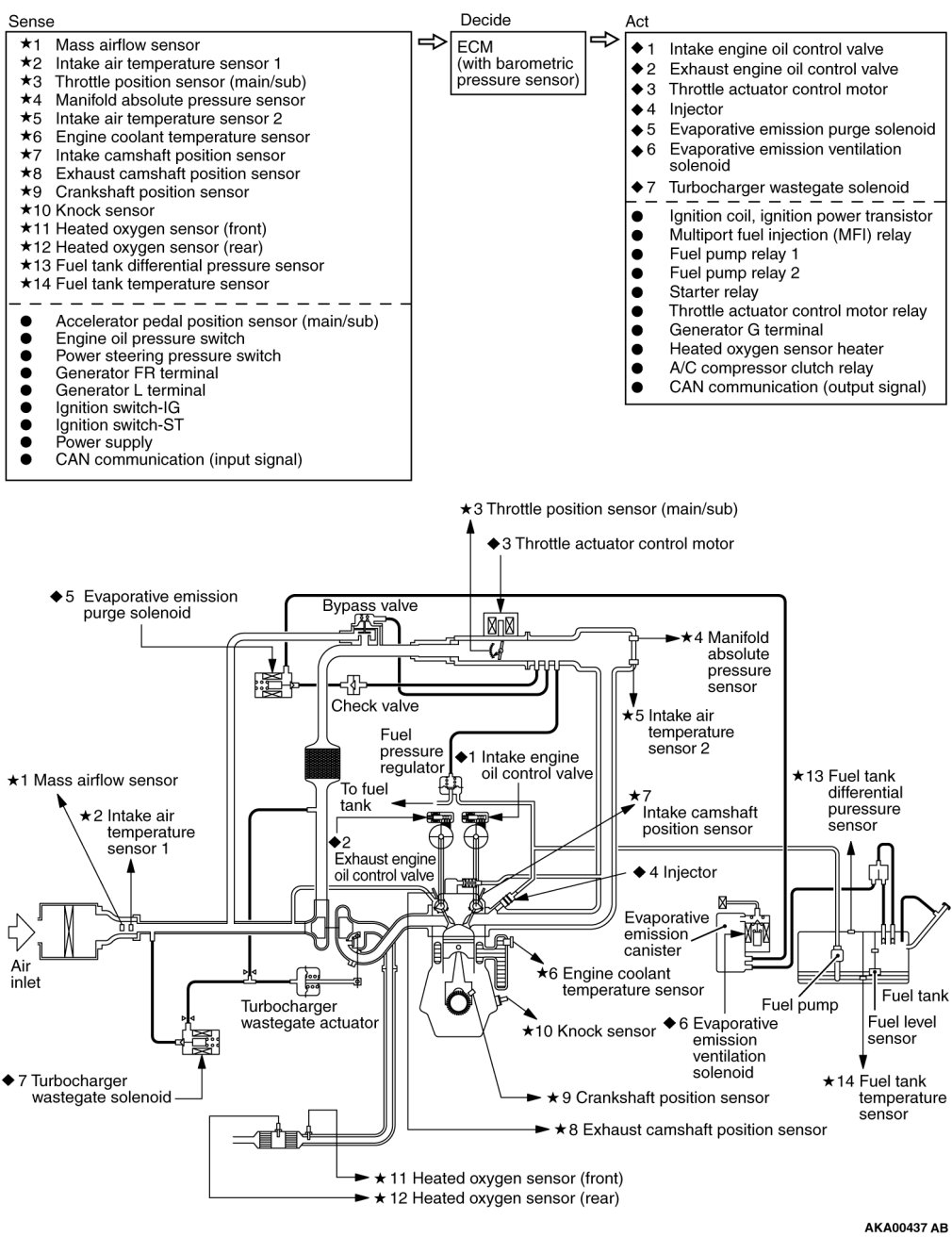 The Multiport Fuel Injection System consists of sensors which detect the engine conditions, the ENGINE CONTROL MODULE (ECM) which controls the system based on signals from these sensors, and actuators which operate under the control of the ECM.