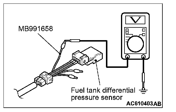 1. Disconnect the fuel tank differential pressure sensor connector and connect special tool MB991658 between the terminals of the disconnected connector.