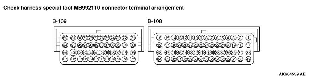 1. Disconnect the ECM connectors B-108 and B-109, and connect check harness special tool MB992110 between the ECM connectors.
