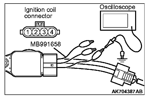 1. Disconnect the ignition coil connector, and connect test harness special tool (MB991658) between the separated connector. (All terminals should be connected.)