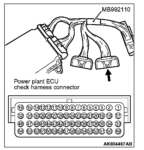 1. Disconnect all ECM connectors. Connect the check harness special tool (MB992110) between the separated connectors.