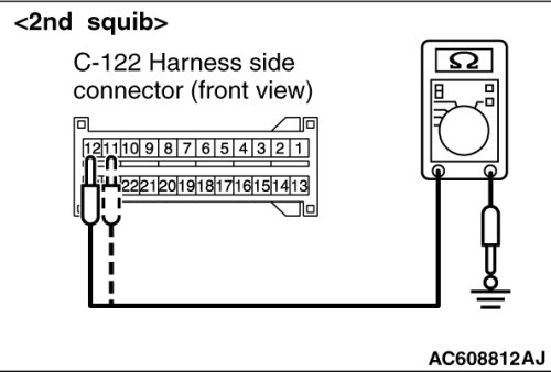 (6)Check for continuity between C-122 harness side connector terminals 7 and 8 [1st squib] or 11 and 12 [2nd squib], and body ground.