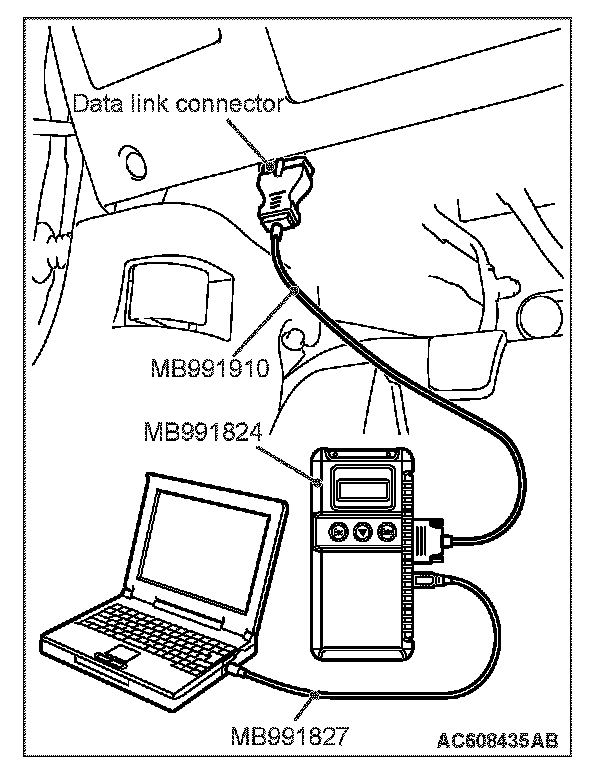 CAUTION: To prevent damage to scan tool MB991958, always turn the ignition switch to the "LOCK" (OFF) position before connecting or disconnecting scan tool MB991958.