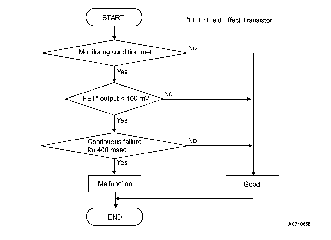 The FET channel output remains 100 mV or more for 400 milliseconds.