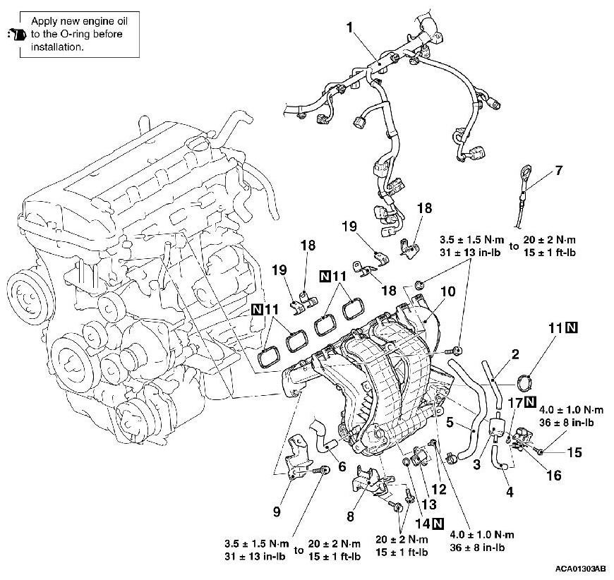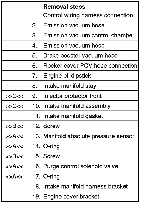 The tightening of the fuel rail assembly, the intake manifold assembly and the injector protector front has the specified order. Temporarily tighten the intake manifold assembly and injector protector front mounting bolts and nuts ) [2.0L ENGINE Non-turbo] or ) [2.4L ENGINE].