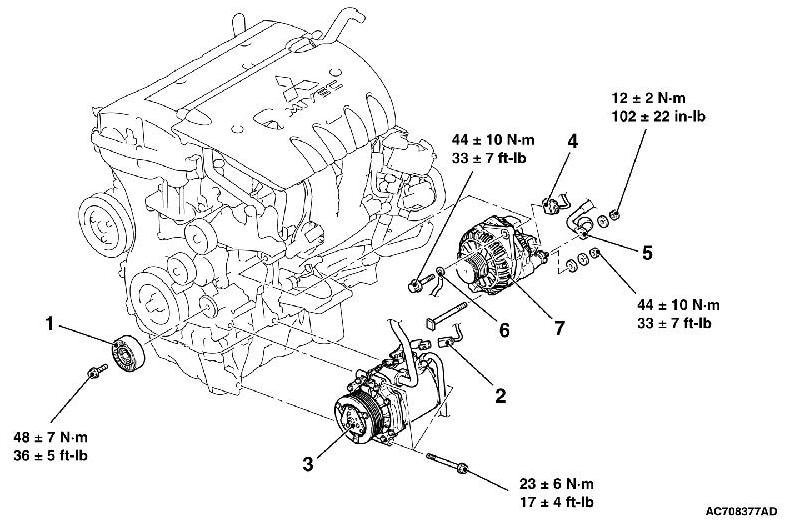 Tighten A/C compressor and clutch assembly mounting bolts to the specified torque in the order of number shown in the illustration.