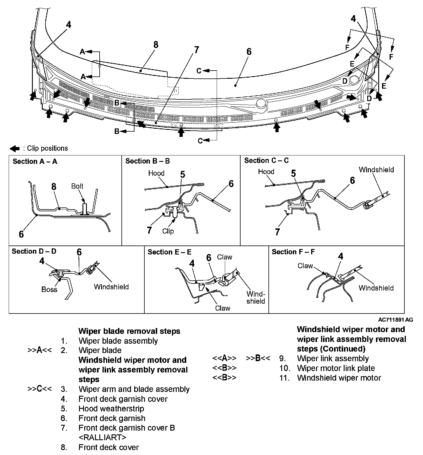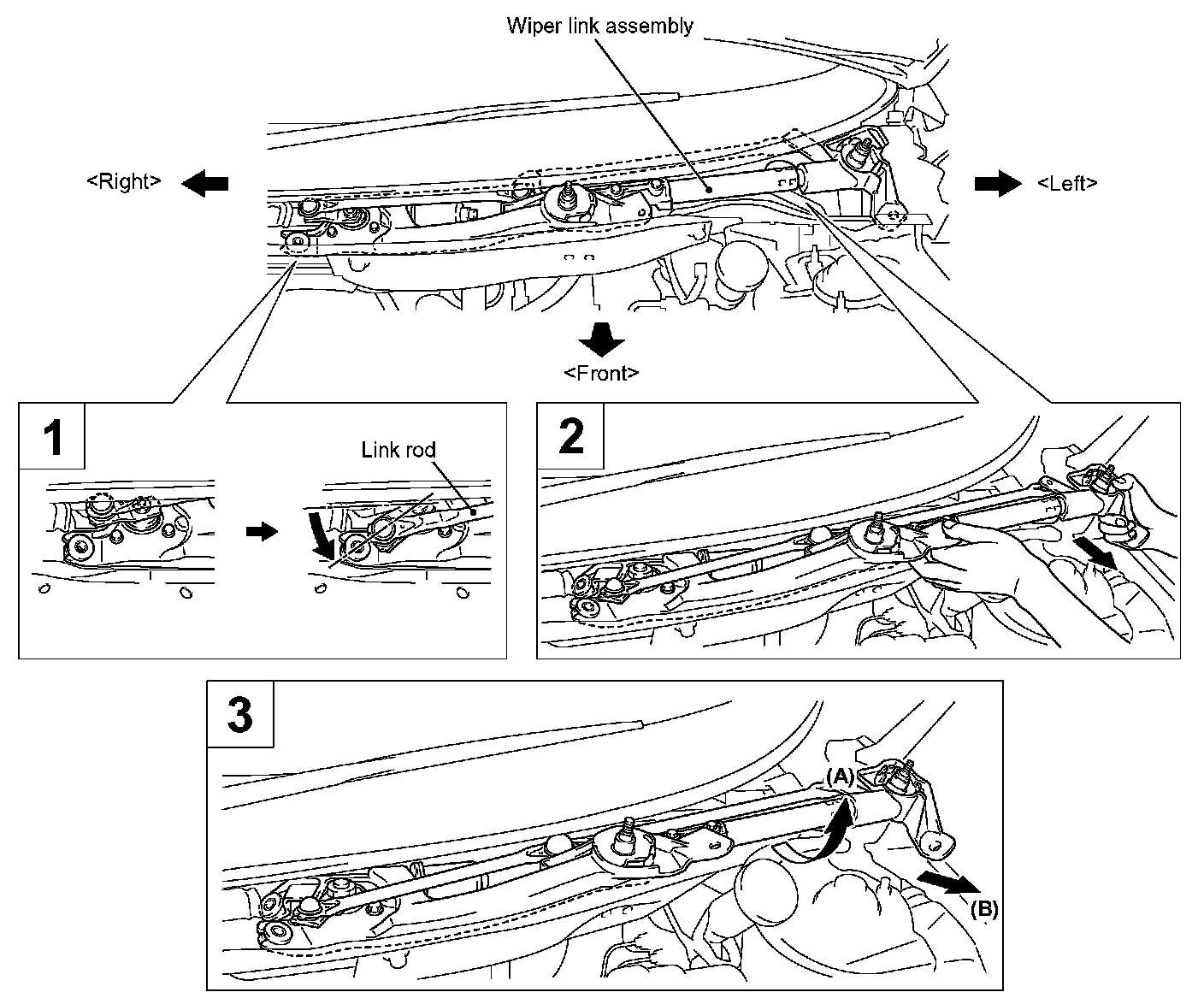 CAUTION: When pulling out the link assembly forward, be careful not to make a contact with the windshield glass.