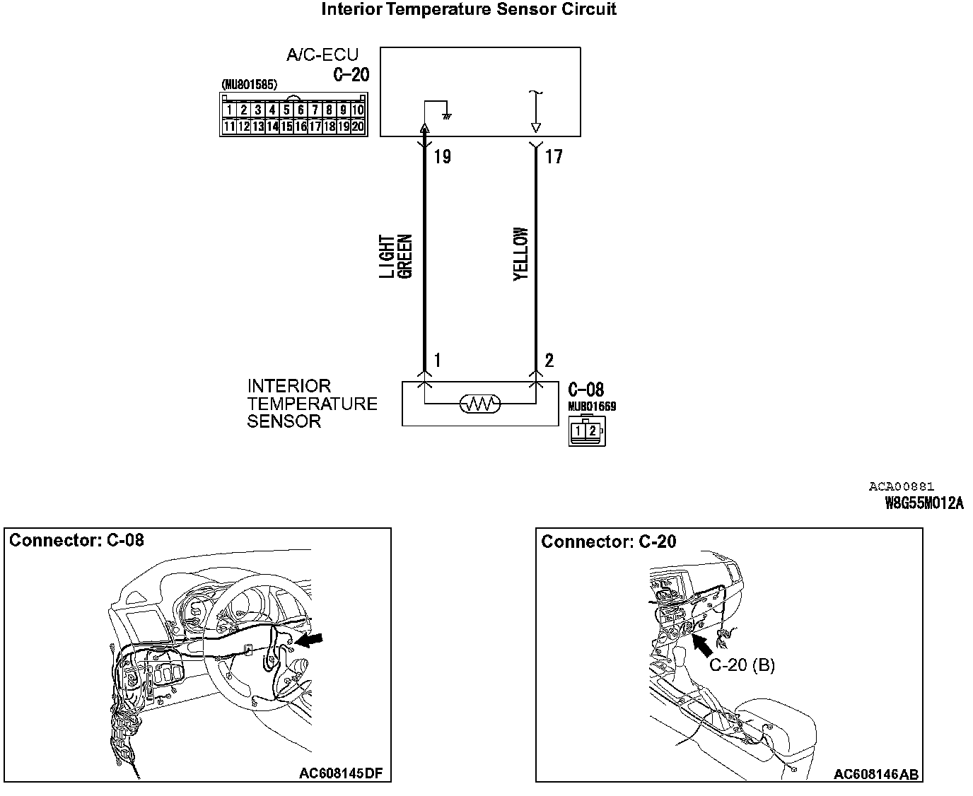 Q : Is the wiring harness between A/C-ECU connector C-20 (terminals 17 and 19) and interior temperature sensor connector C-08 (terminals 2 and 1) in good condition?