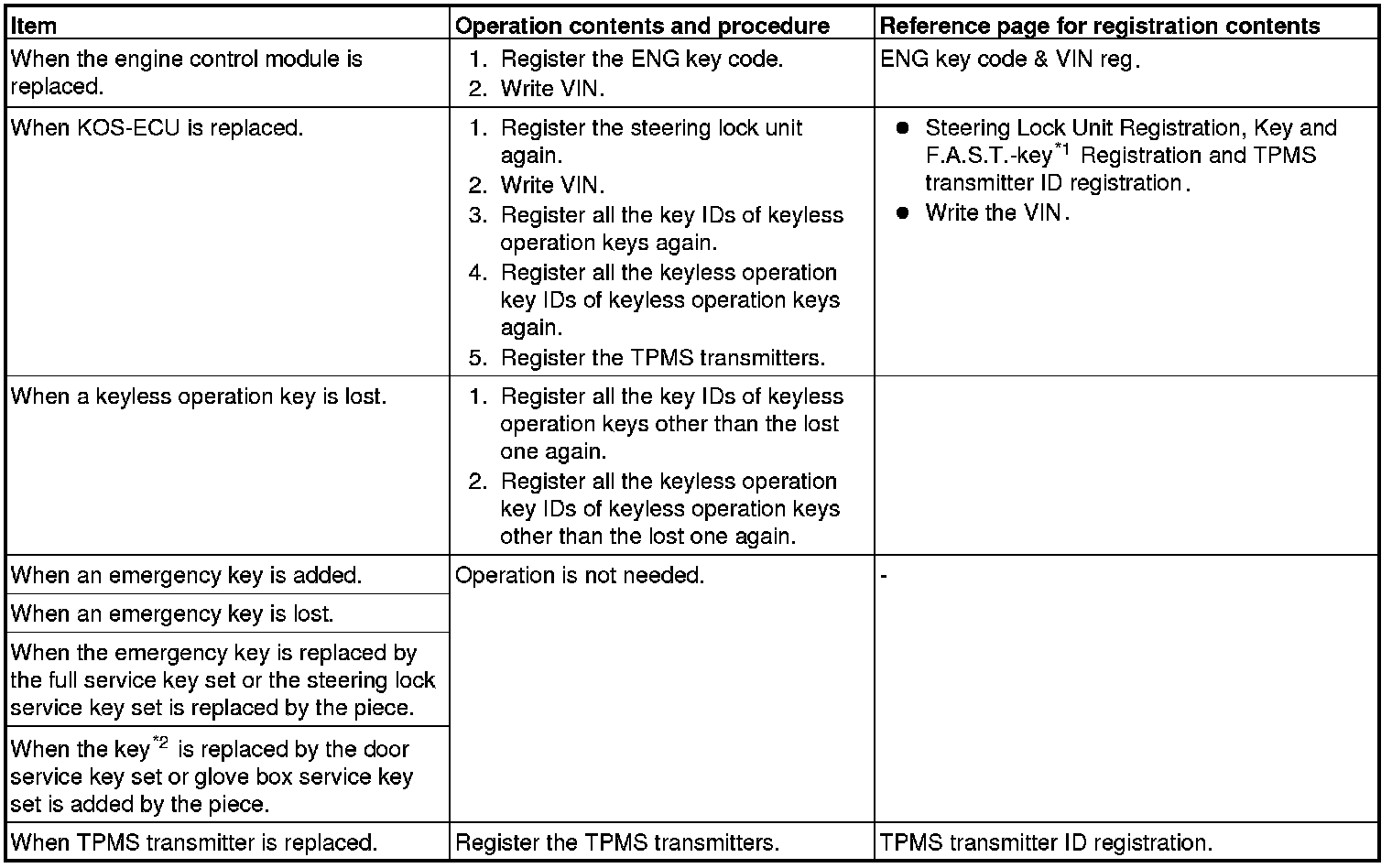 The individual unique ID code is stored in the transponder (small transmitter) and KOS-ECU, engine control module (ECM), keyless operation key, and steering lock unit for KOS. Under the conditions shown in the table, the corresponding ID code has to be registered in KOS-ECU or the ECM again.