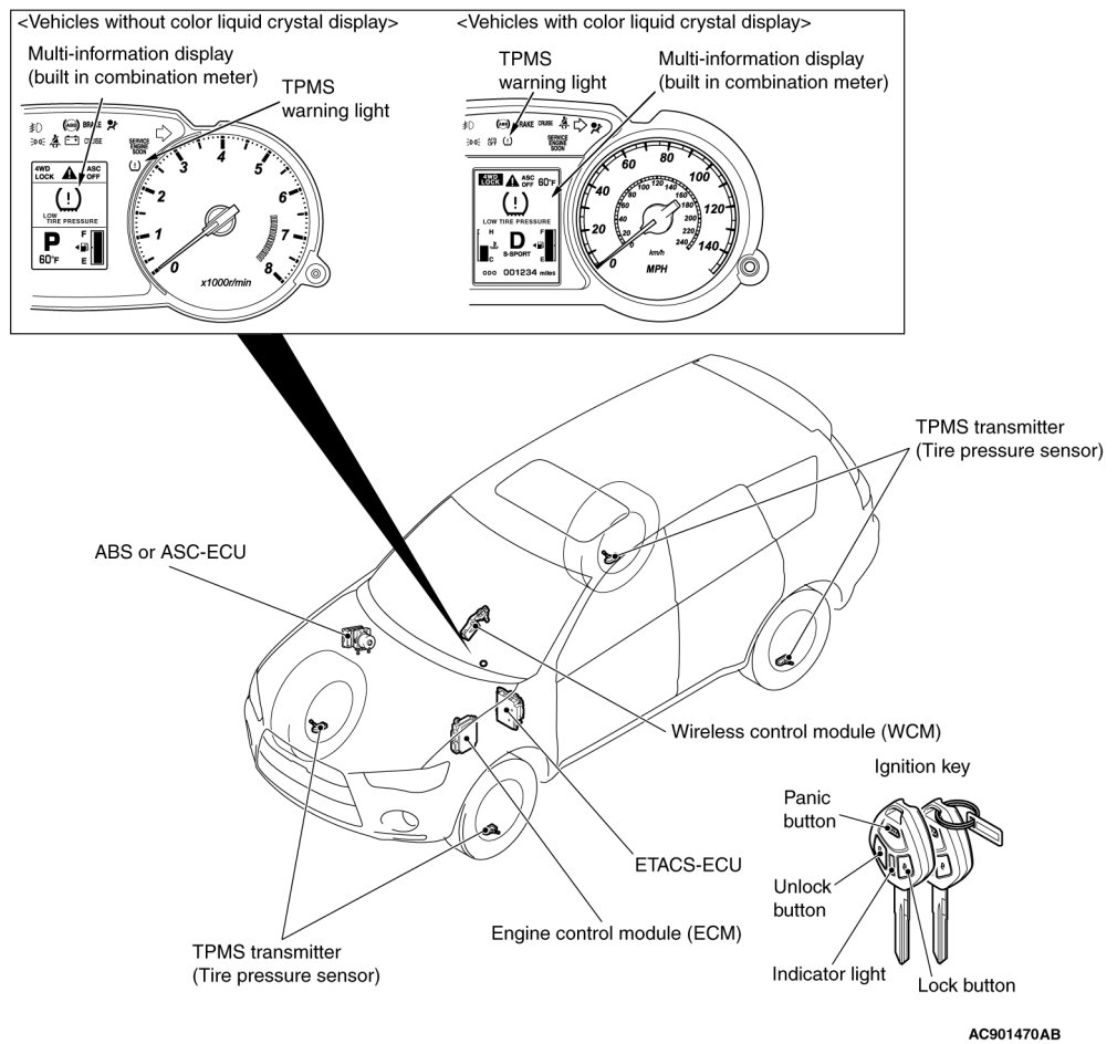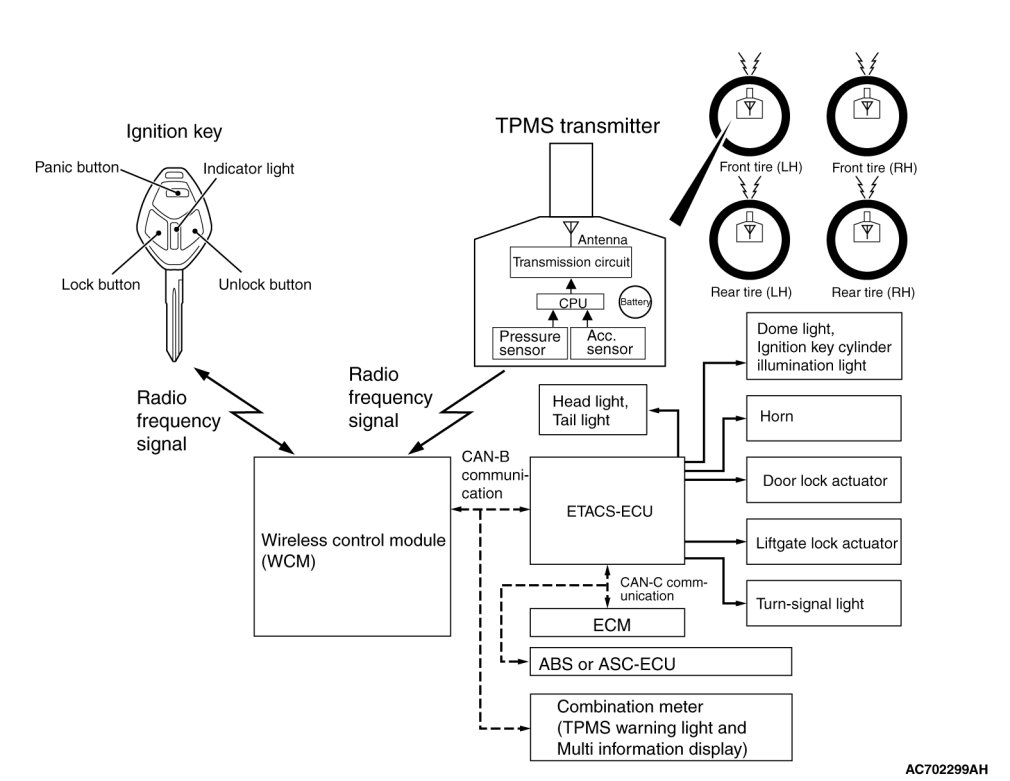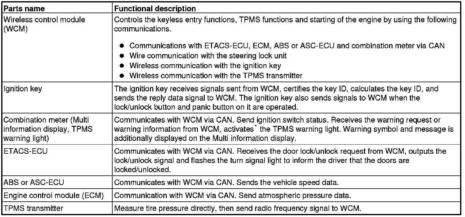 The wireless control module (WCM) is a system that integrates the keyless entry function, with which remote operation (opening/closing of all doors and the liftgate and operation of warning function that warns a person who intends to damage the vehicle *), can be performed by operating the lock/unlock button or panic button on the ignition key (transmitter). Also, WCM incorporates the immobilizer function, which prohibits the starting of engine using an unauthorized key, and the tire pressure monitoring system (TPMS), which issues a warning to a driver by illuminating or flashing the warning light if an abnormality to the tire pressure is detected. WCM has the following features: