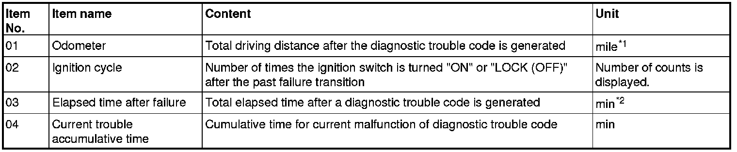 - *2: Total elapsed time can be stored up to 65,534 minutes (45.5 days). The display of scan tool is fixed to 65,534 minutes after 65,534 minutes have elapsed. Or, if the battery is disconnected, the total elapsed time cannot be measured properly. Thus, 65,535 minutes (null value) is displayed. Because it is calculated based on the ETACS-ECU information, the correct display may not be shown if the ETACS-ECU has had a timeout.