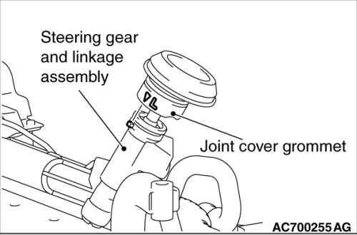 Install the joint cover grommet to the steering gear and linkage assembly by aligning the mating marks as shown in the figure.