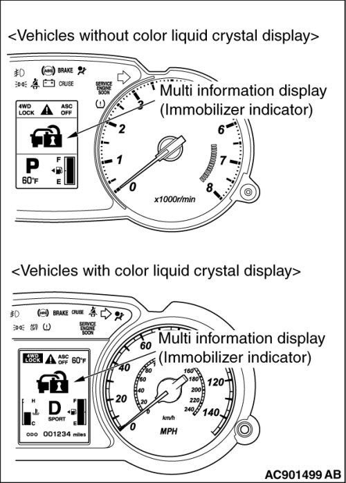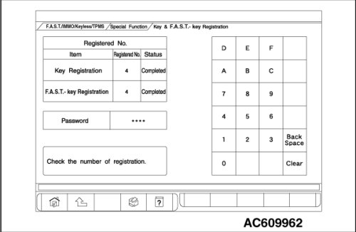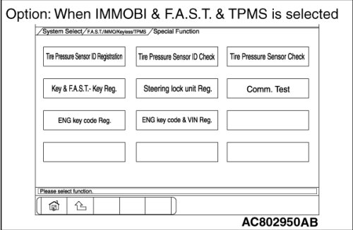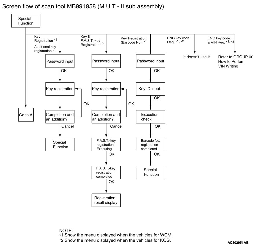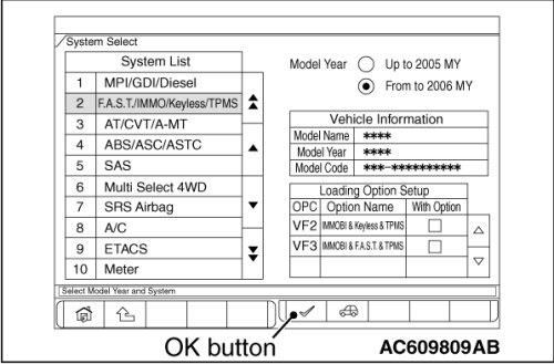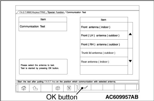 By operating the scan tool MB991958 (M.U.T.-III sub assembly) screen, the ID code registration and the TPMS can be registered and antenna communication required to the keyless operation system can be performed. KOS and keyless operation key are indicated as F.A.S.T and F.A.S.T.-key respectively in the scan tool MB991958 (M.U.T.-III sub assembly) screen.