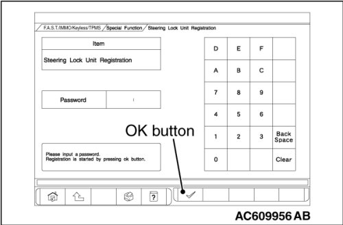 1. Enter the password on "Steering Lock Unit Registration" screen and press the OK button to register the KOS ID.