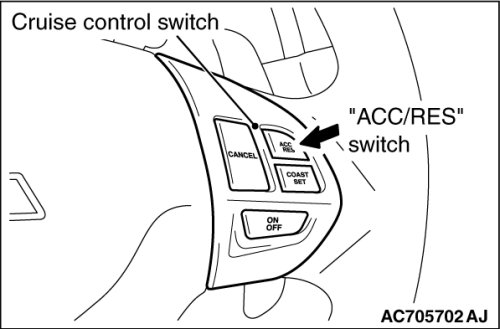 5. Check to be sure that acceleration continues while the "ACC/RES" switch is pressed, and that the speed at the time it was released becomes the constant driving speed.