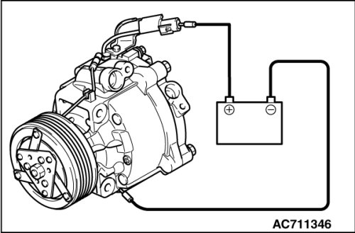 Connect the compressor connector terminal to the battery positive (+) terminal and ground the battery's negative (-) terminal to the compressor unit. At that time, the A/C compressor clutch should make a definite operating sound.