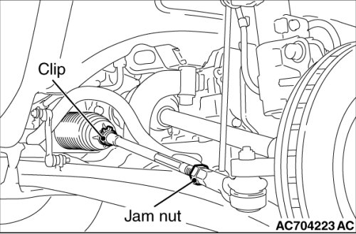 1. Adjust the toe-in by undoing the clip and jam nut, and turning the left and right tie rod turnbuckles by the same amount (in opposite directions).