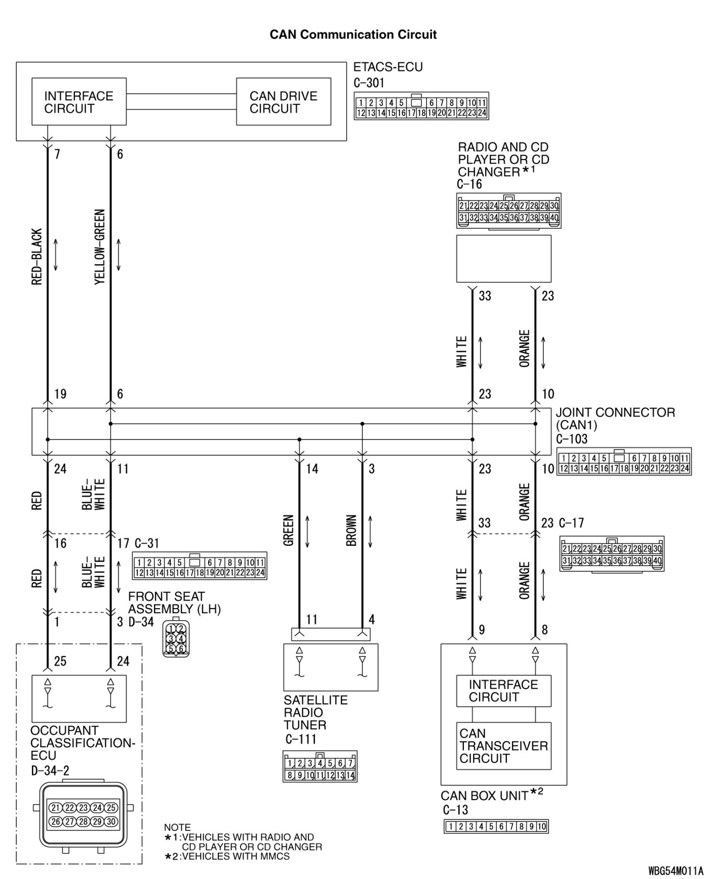 (1)Disconnect joint connector (CAN1) C-103 and radio and CD player or radio and CD changer connector C-16, and check the wiring harness.