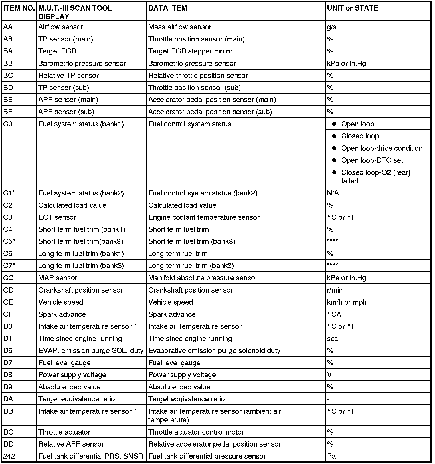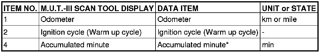 *: Data items are displayed on M.U.T.-III display, but the in-line 4 engine is not applicable and its data is displayed as "N/A" or "****".