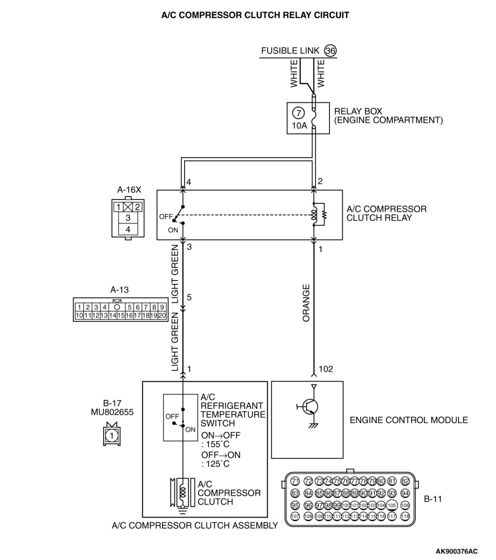- When the A/C switch ON signal is input into the ECM, the ECM turns ON the A/C compressor relay. This causes battery positive voltage to be supplied to the A/C compressor and the magnet clutch actuates.