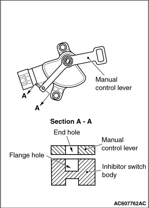4. Align the hole at the end of the manual control lever and the hole in the Transmission range switch body flange (section A - A).